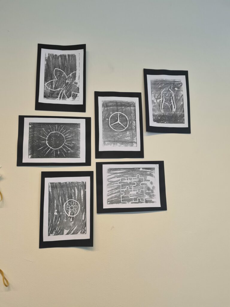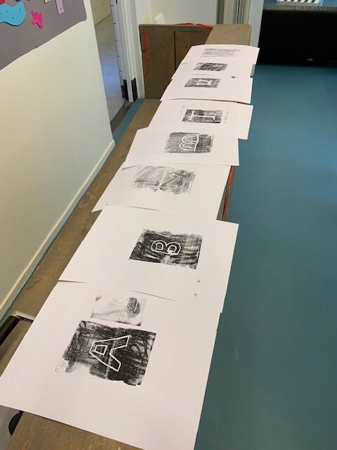 We hebben met ze alle een Bits alfabet gemaakt. Iedereen maakte 1 of 2 letters. Het is gemaakt met lino, de leerlingen hebben de letters uitgesneden en daarna met inkt op papier gezet.
